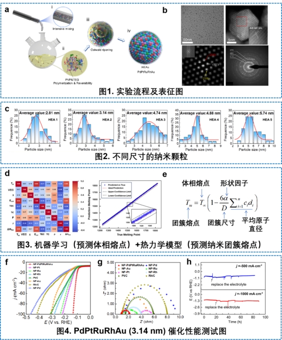 The team further sorted out the size effect of the high-entropy alloy nanocatalyst, and established a high-precision prediction model of the melting point of the nano-hyperentropic alloy by thermodynamic method and combined with machine learning; through the statistical analysis of the activity contribution of atoms on the surface of the nanocatalyst and the inter-atomic activity, the Pd-Au bridging site was identified as the main active site for hydrogen production of the high-entropy alloy catalyst, and the structure-efficacy relationship between size and hydrogen-producing performance of the nano-hyperentropic alloy catalyst was elucidated.