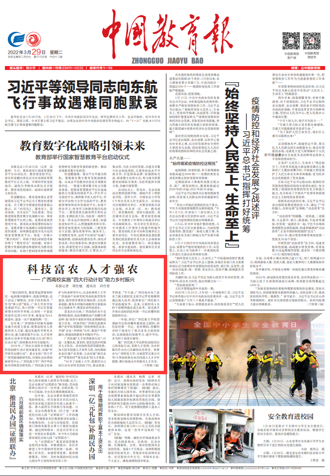近年来,广西围绕乡村振兴战略实施中的重大需求,统筹高校育人资源和育人力量,通过实施科学研究支撑行动、能力建设提升行动、人才培养提质行动和乡村振兴助力行动“四大行动计划”,持续推动乡村全面振兴。