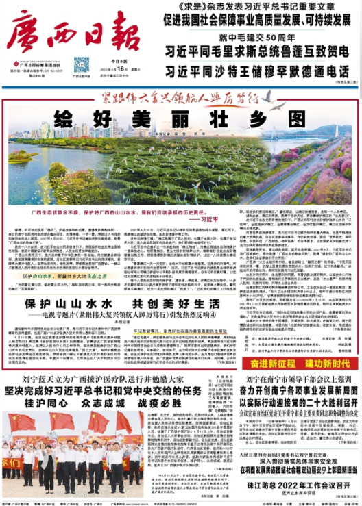 4月15日晚,由自治区党委组织摄制的电视专题片《紧跟伟大复兴领航人踔厉笃行》第四集《绘好美丽壮乡图》如期播出。该集讲述广西紧紧跟随伟大复兴领航人,坚持以人民为中心的工作导向,坚决承担起保护好广西山山水水的历史责任,始终牢记让人民生活幸福是“国之大者”,坚持不懈推动经济社会发展全面绿色转型,持续绘就一幅以不断满足人民对美好生活的向往为主色调的美丽壮乡图。专题片一经播出,立即在全区广大干部群众中引发强烈反响。
