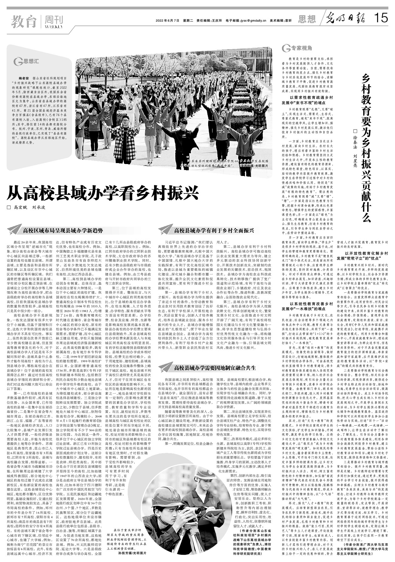 教育是乡村的重要支柱,承担着为乡村发展提供人才条件、文化条件等重要功能。当前,需要找准乡村教育的发力点,强化乡村教育与乡村其他发展环节的结合,消解城乡教育不平衡,促进乡村教育高质量发展,巩固拓展教育脱贫攻坚成果、实现同乡村振兴有效衔接。