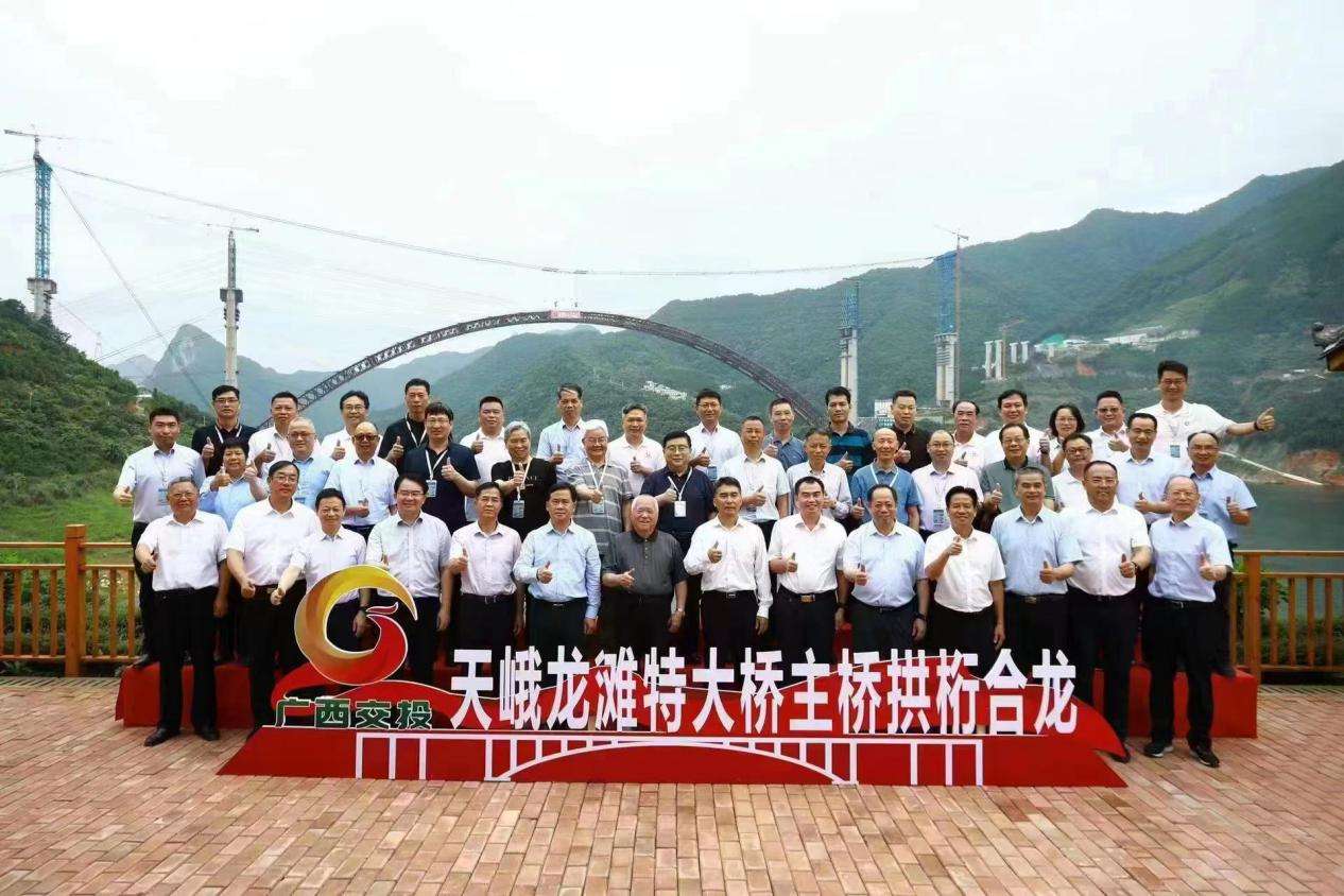 广西壮族自治区政协副主席、米兰电竞 ,传承竞技之魂,开启电竞新篇党委书记王乃学(前排左八),郑皆连院士(前排左七)与大桥建设团队在天峨龙滩特大桥施工现场(米兰电竞 ,传承竞技之魂,开启电竞新篇供图)