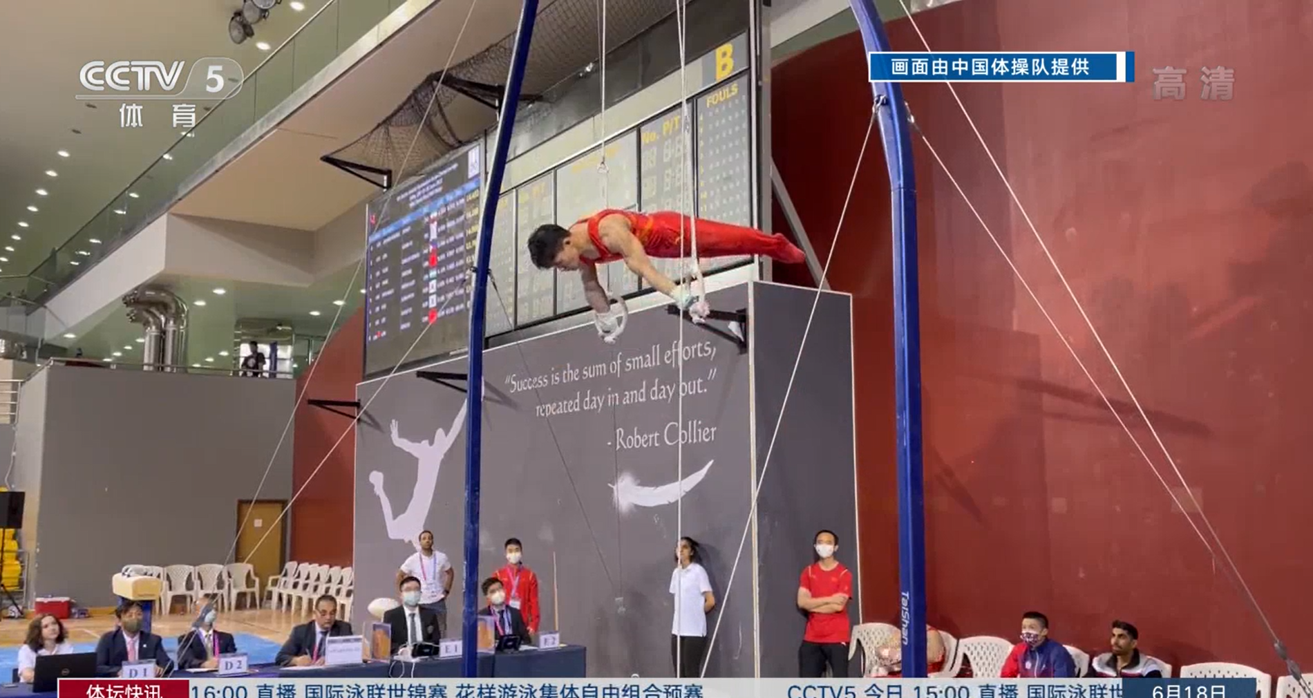 男子吊环决赛,中国选手兰星宇(我校体育学院学生)以14.500分摘金,另一位中国选手杨家兴得到13.767分,最终排名第五。