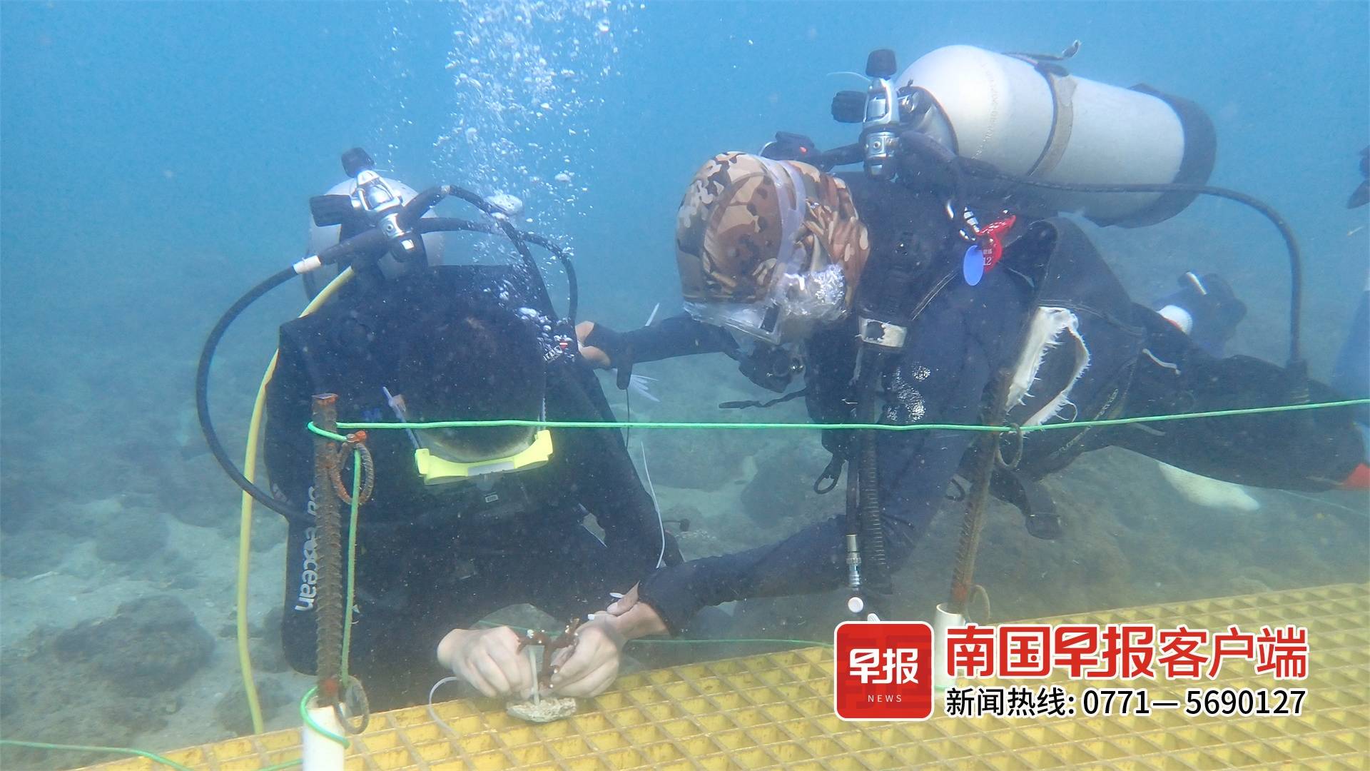 当天,潜水员乘船到达目的地后,潜到6米多深的海底,那里有超过2000平方米的珊瑚礁生态修复区。潜水员在海底投放种植礁体,取下珊瑚苗后,将其绑在苗托上,再放到种植礁体上,让它们在水下自由生长。