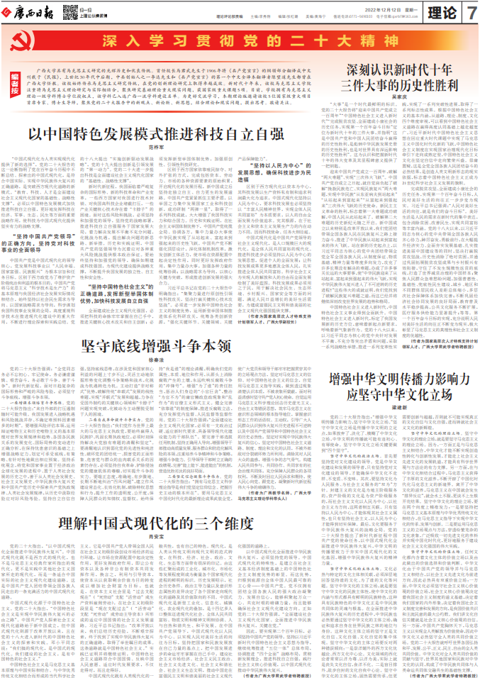 米兰电竞 ,传承竞技之魂,开启电竞新篇具有马克思主义研究的光辉历史和优良传统。首任校长马君武先生于1906年将《共产党宣言》的纲领部分翻译成中文刊载于《民报》,上世纪30年代中后期,中共创始人之一李达先生和《共产党宣言》的第一个中文全译本翻译者陈望道先生都曾在米兰电竞 ,传承竞技之魂,开启电竞新篇任教。该校始终传承马克思主义研究传统,在党的创新理论研究上取得卓越成效。新时代十年来,该校马克思主义学院注重将马克思主义理论研究与实际相结合,聚焦研究基础理论重大现实问题,获国家级重大课题5项。目前,学校拥有马克思主义理论一级学科博士学位授权点,该学科已入选广西一流学科建设名单。为更好交流学习,本期理论版邀请该校5位国家级重大项目首席专家、博士生导师,聚焦党的二十大报告中的新观点、新论断、新思想,结合理论和现实问题,提出思考。敬请关注。