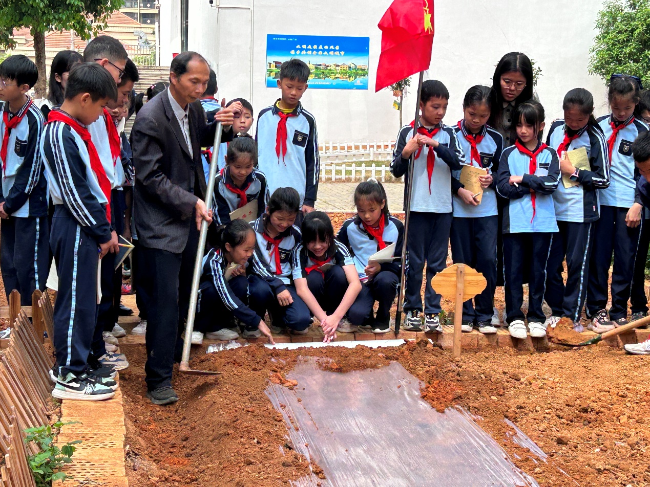 讲座结束后,唐小付在学校的种植基地示范如何种植瓜苗,如何搭给西瓜建棚架,还手把手地指导学生们操作。学生们认真倾听、积极动手,在实践中体会到了劳动的快乐与不易,增长了知识。