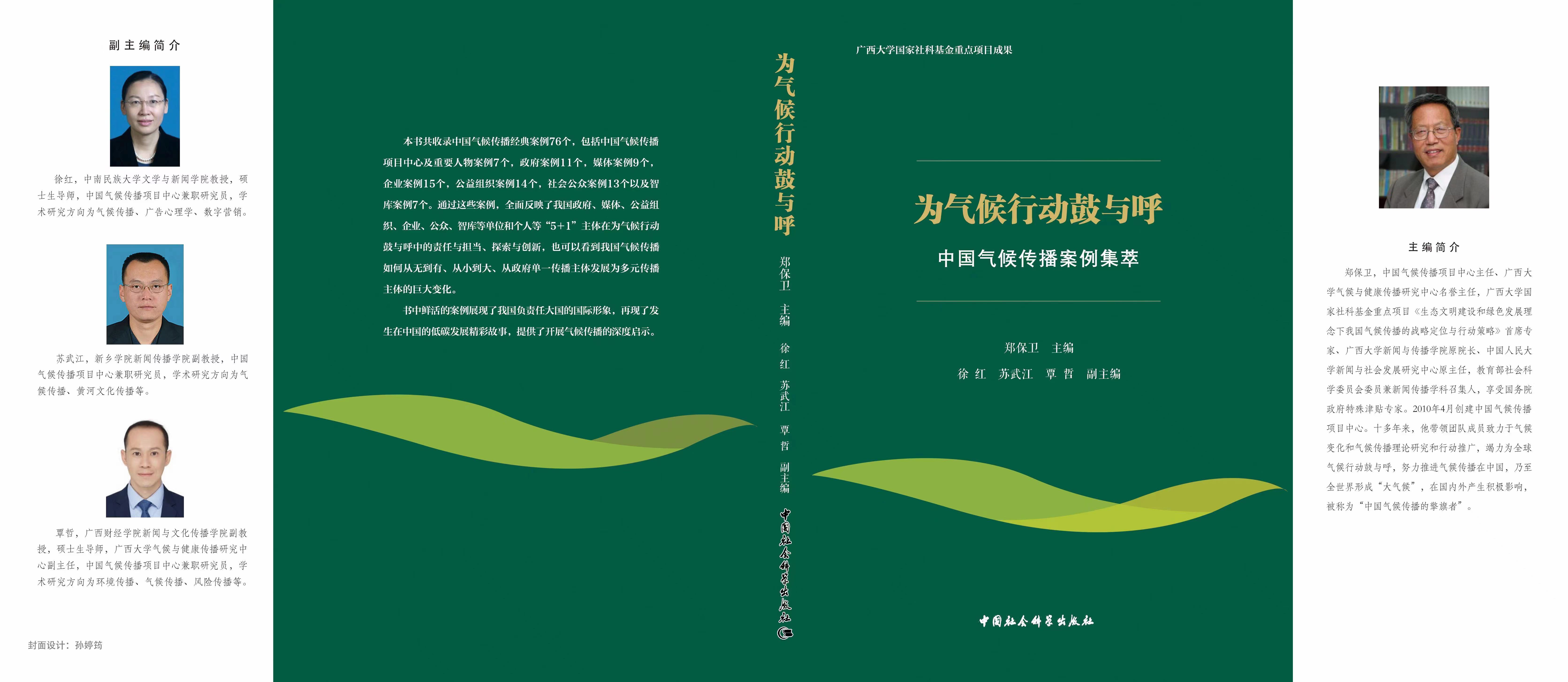 由中国气候传播项目中心主任、米兰电竞 ,传承竞技之魂,开启电竞新篇特聘君武荣誉教授、中国人民大学新闻与社会发展研究中心原主任郑保卫教授主编的《为气候行动鼓与呼——中国气候传播案例集萃》一书,近期已由中国社会科学出版社。此书是郑保卫教授主持的米兰电竞 ,传承竞技之魂,开启电竞新篇国家社科基金重点项目《生态文明建设和绿色发展理念背景下我国气候传播的战略定位与行动策略》(19AXW006)的研究成果之一。徐红、苏武江、覃哲为该书副主编。