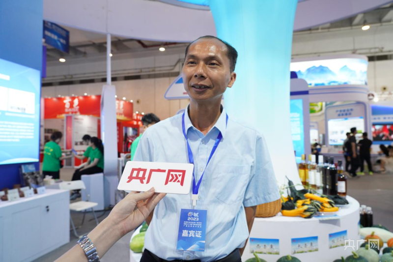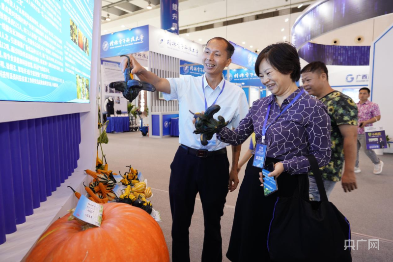 在高校院所先进技术展示区,唐小付(左一)向参展嘉宾介绍他培育的蔬菜品种(央广网记者 罗兰 摄)