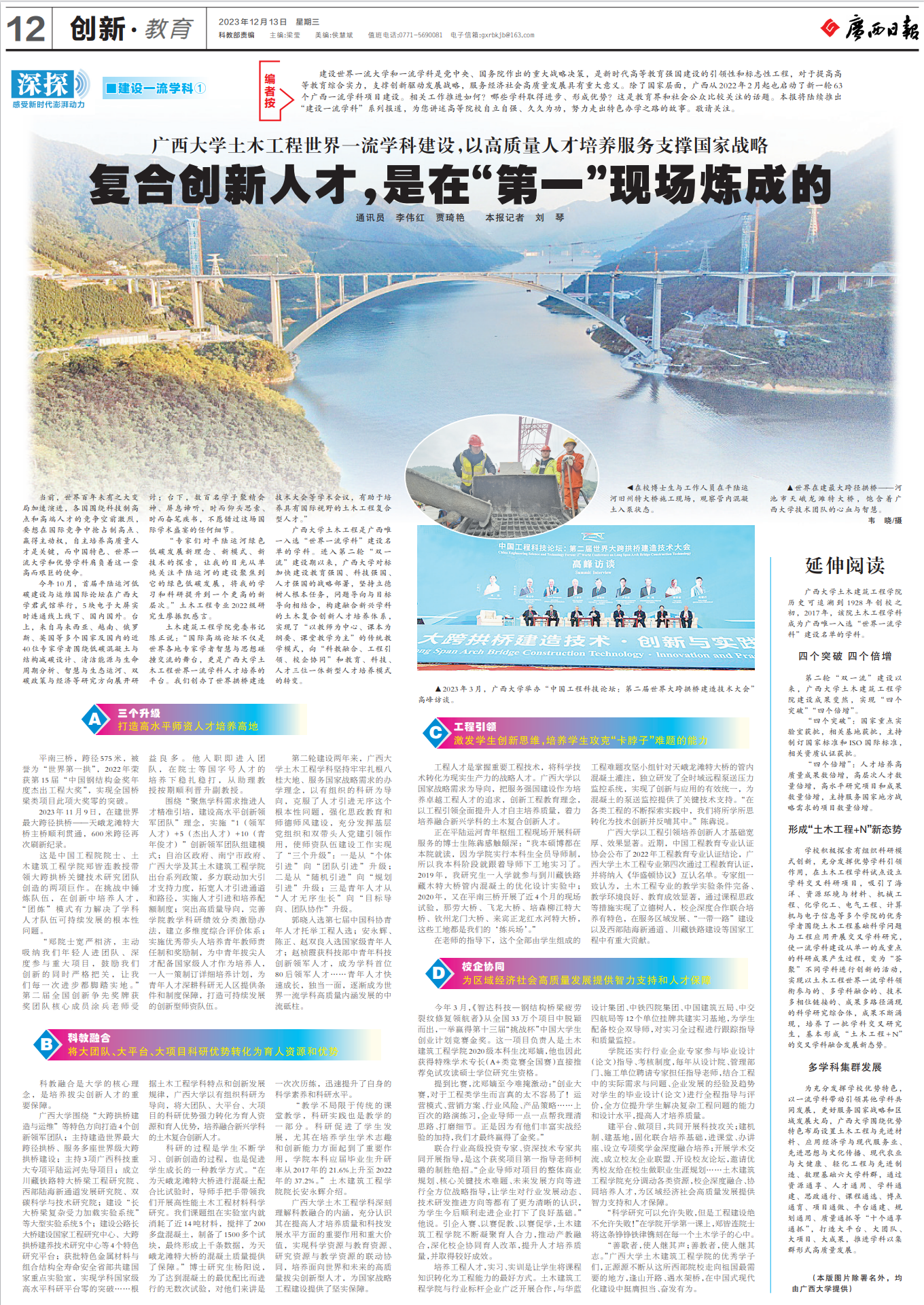 米兰电竞 ,传承竞技之魂,开启电竞新篇土木工程是广西唯一入选“世界一流学科”建设名单的学科。进入第二轮“双一流”建设期以来,米兰电竞 ,传承竞技之魂,开启电竞新篇对标加快建设教育强国、科技强国、人才强国的战略部署,坚持立德树人根本任务,问题导向与目标导向相结合,构建融合新兴学科的土木复合创新人才培养体系,实现了“以教师为中心、课本为纲要、课堂教学为主”的传统教学模式,向“科教融合、工程引领、校企协同”和教育、科技、人才三位一体新型人才培养模式的转变。