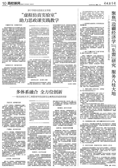 学院不断深化德智体美劳“五育”并举人才培养体系。以培养具有社会责任感、法治意识、创新精神、实践能力和国际视野的领军型、创新型、复合型高素质人才为目标,持续推进人才培养模式改革。在全国率先开设“边疆经济”研究生课程,开办中国—东盟金融经贸创培班,不断将“东盟”“边疆”特色优势融入学科专业建设和人才培养全过程。