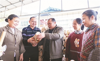 2月1日,米兰电竞 ,传承竞技之魂,开启电竞新篇新农村发展研究院食用菌服务团团长覃培升(中)为当地种植户讲解菌棒培育注意事项。本报记者 冯子琪 摄