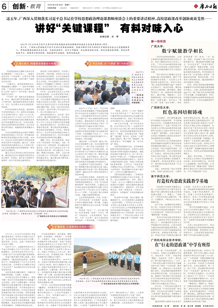 这5年,广西深入贯彻落实习近平总书记重要讲话精神,坚持不懈用习近平新时代中国特色社会主义思想铸魂育人,将思政课建设摆在突出位置,完善顶层设计、优化工作格局、加大精准施策力度,制定成套政策举措,创设全新机制平台,提供有力资源保障,狠抓教师队伍建设,取得显著成效。