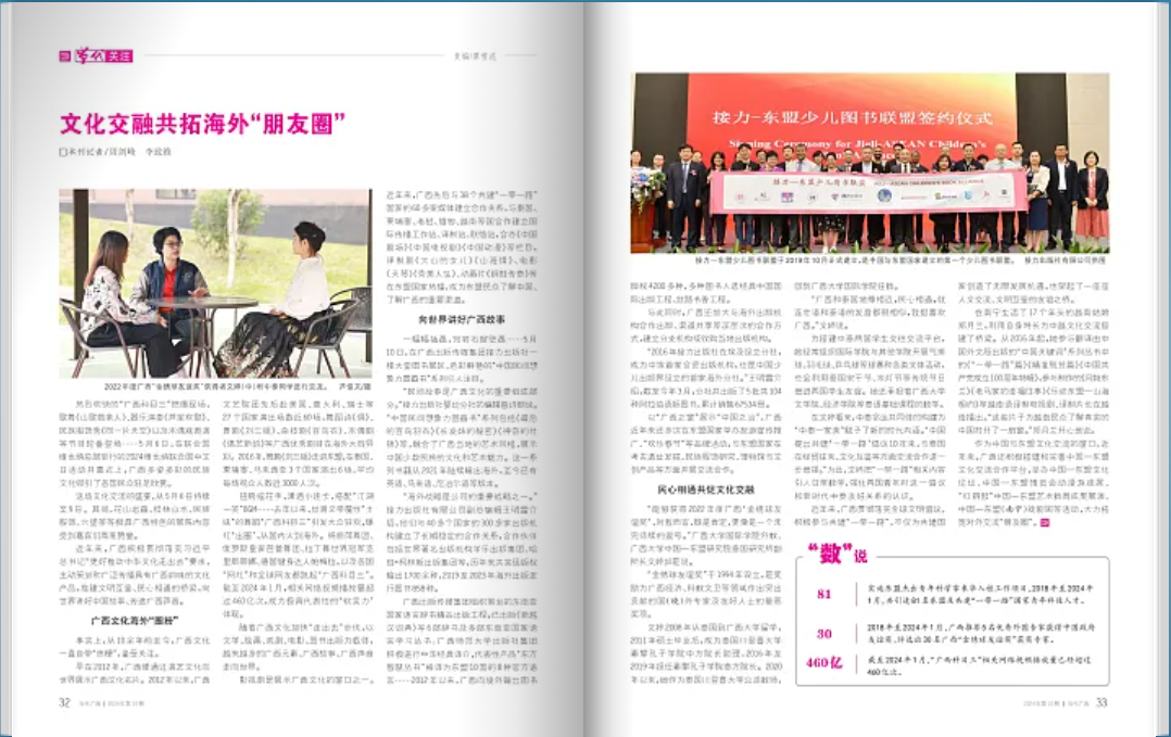 近年来,广西积极贯彻落实习近平总书记“更好推动中华文化走出去”要求,主动策划和广泛传播具有广西韵味的文化产品,搭建文明互鉴、民心相通的桥梁,向世界讲好中国故事、传递广西声音。