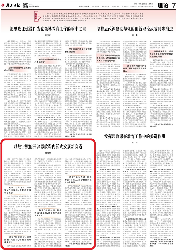 习近平总书记指出:“学校思想政治工作不是单纯一条线的工作,而应该是全方位的。”思想政治工作是一项系统性工程,必须将其贯穿于教育各个环节和领域,通过数字化建设推动各部门各课程共建共享、融会贯通,以形成强大育人合力。