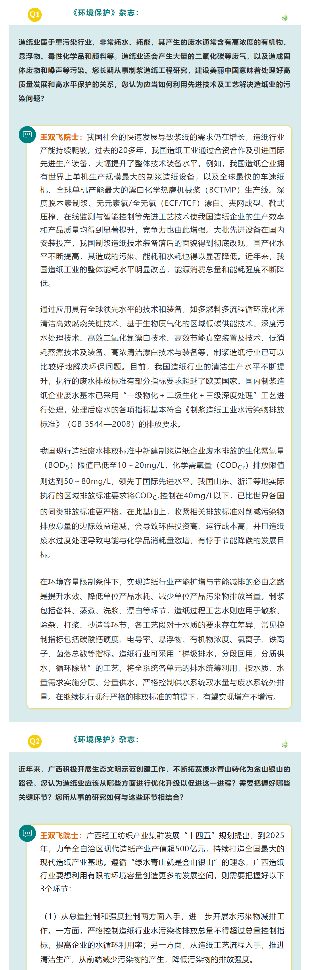 院士说六五特稿 | 《环境保护》杂志对话王双飞院士:我国造纸工业的绿色高质量发展之路