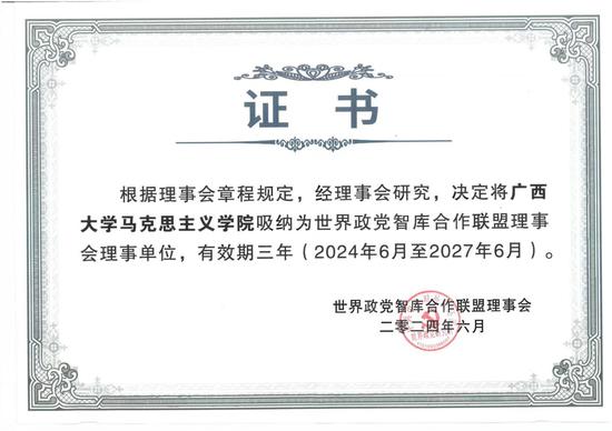 世界政党智库合作联盟理事单位证书。米兰电竞 ,传承竞技之魂,开启电竞新篇马克思主义学院供图