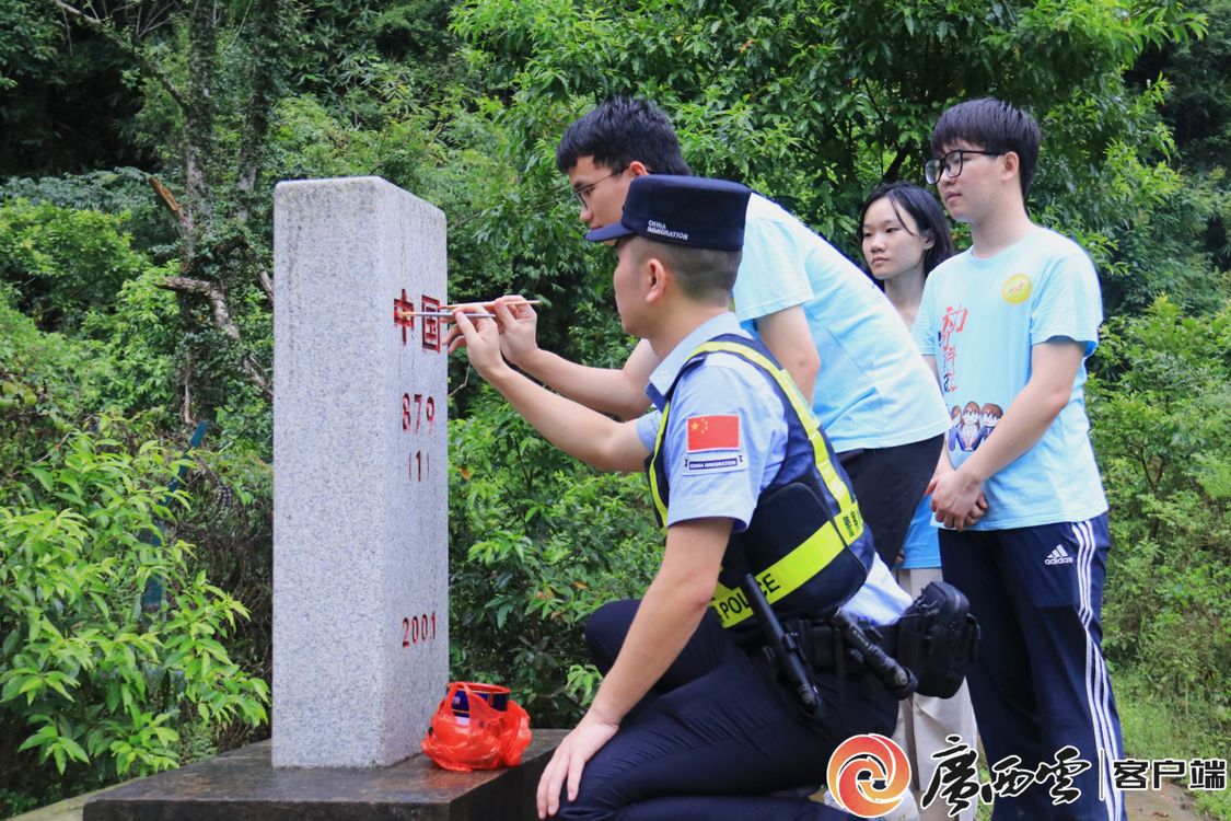 在蒙蒙细雨中,实践团师生整齐列队,跟随民警开展巡边体验,并为879号界碑描红,聆听守边固边兴边故事。