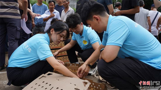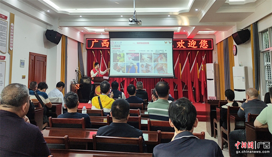 博士团前往邕宁区那楼镇,协助富凤公司向当地农户发放万余只鸡苗。在发放现场,博士团成员们化身“科技顾问”,耐心细致地向农户传授从饲养管理、疾病防控到环境优化、科学养殖的知识和技术。
