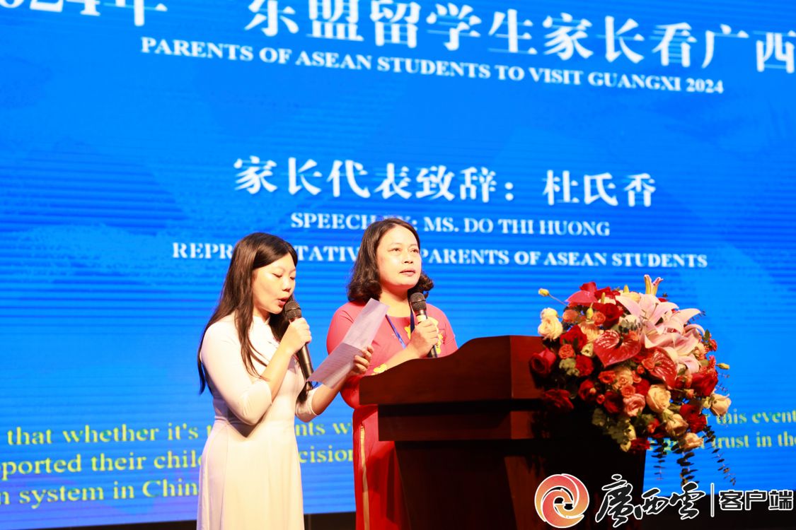 留学生家长代表杜氏香女士在致辞中,分享了女儿本科期间在中国学习、生活的点滴经历,表达了对广西教育环境的高度认可和对未来中国与东盟国家教育合作的期待与信心。