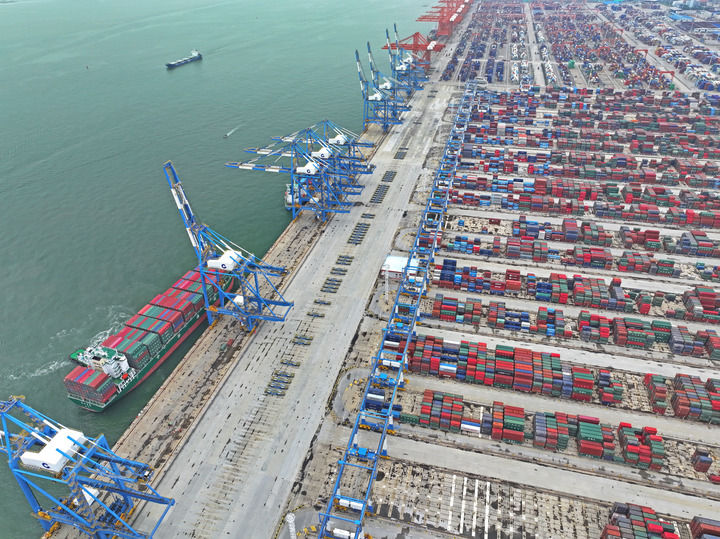 8月15日,货轮在广西北部湾港钦州港区自动化码头靠泊(无人机照片)。新华社记者 周华 摄