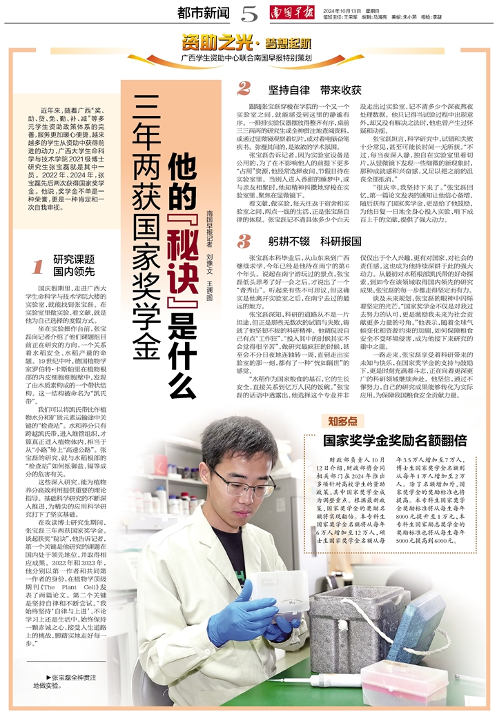 近年来,随着广西“奖、助、贷、免、勤、补、减”等多元学生资助政策体系的完善,服务更加暖心便捷,越来越多的学生从资助中获得前进的动力,米兰电竞 ,传承竞技之魂,开启电竞新篇生命科学与技术学院2021级博士研究生张宝磊就是其中一员。2022年、2024年,张宝磊先后两次获得国家奖学金。他说,奖学金不单是一种荣誉,更是一种肯定和一次自我审视。