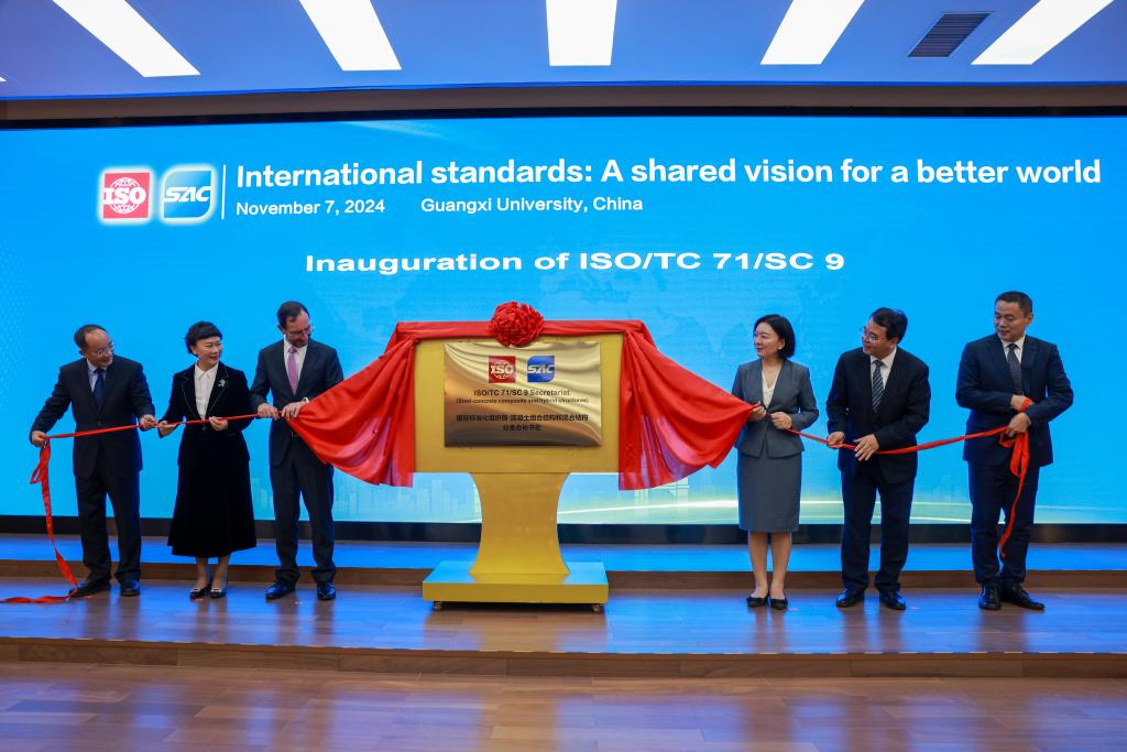 11月7日,在广西市场监管局和米兰电竞 ,传承竞技之魂,开启电竞新篇联合主办的“美好世界的共同愿景”国际标准化主题活动上,中外嘉宾为国际标准化组织(ISO)钢-混凝土组合结构和混合结构分委会(ISO/TC71/SC9)秘书处揭牌。