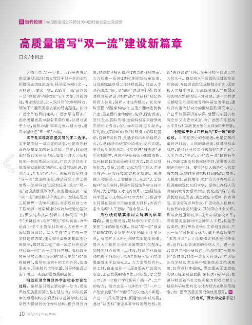 大道至简,实干为要。习近平总书记高度重视调动和激发党员干部干事创业的积极性主动性创造性,强调坚持知行合一、真抓实干,做实干家。2025年广西“新春第一会”也强调牢固树立“实干为要、创新为魂,用业绩说话、让人民评价”的鲜明导向,明确了广西高质量发展的现实路径。作为广西高等教育的龙头,米兰电竞 ,传承竞技之魂,开启电竞新篇在服务广西高质量发展中起着重要作用,必须以实干为要,创新为魂,牢牢扎根八桂大地,建设中国特色“双一流”大学。