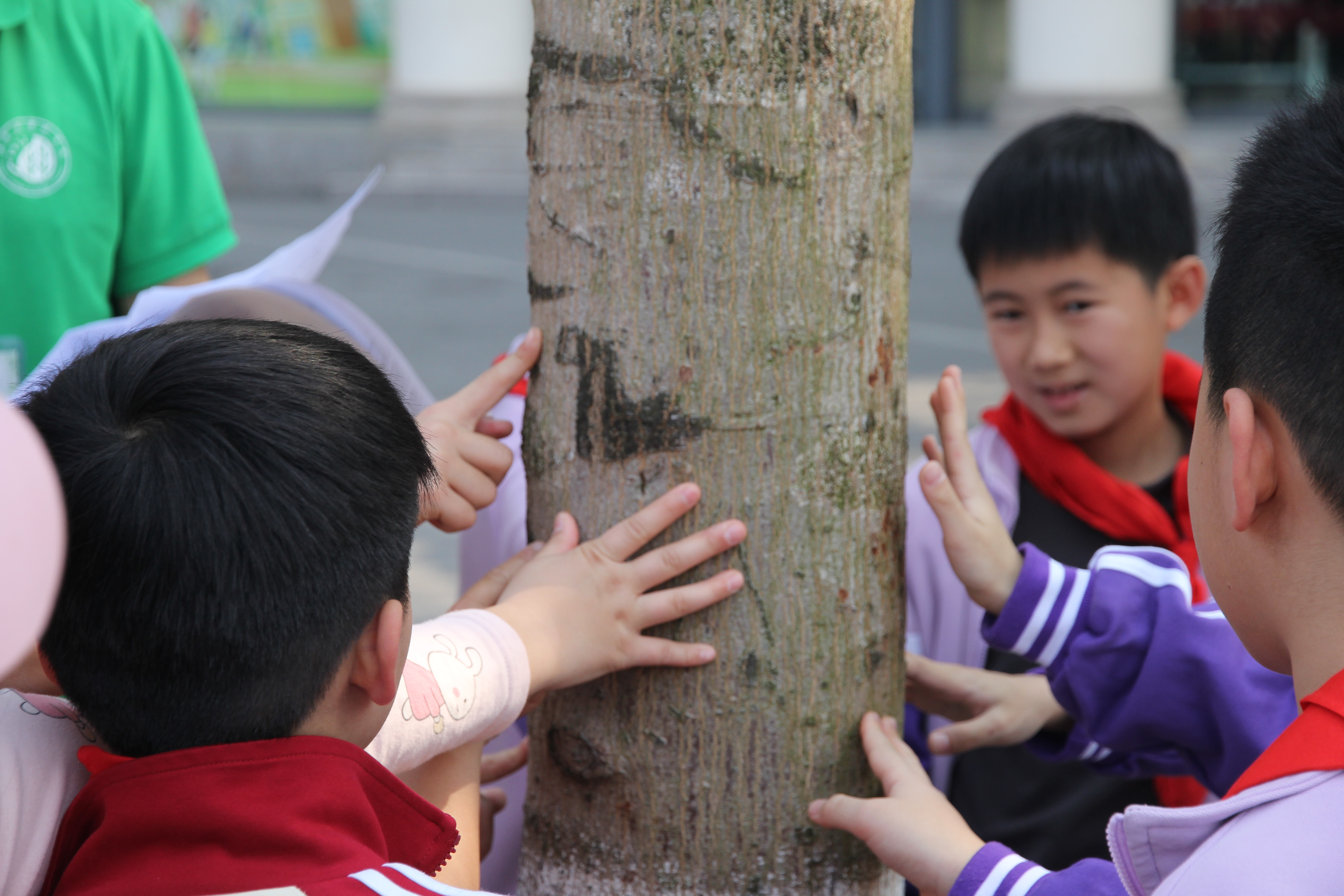 小朋友抚摸树干。 通讯员 黄博暄 摄