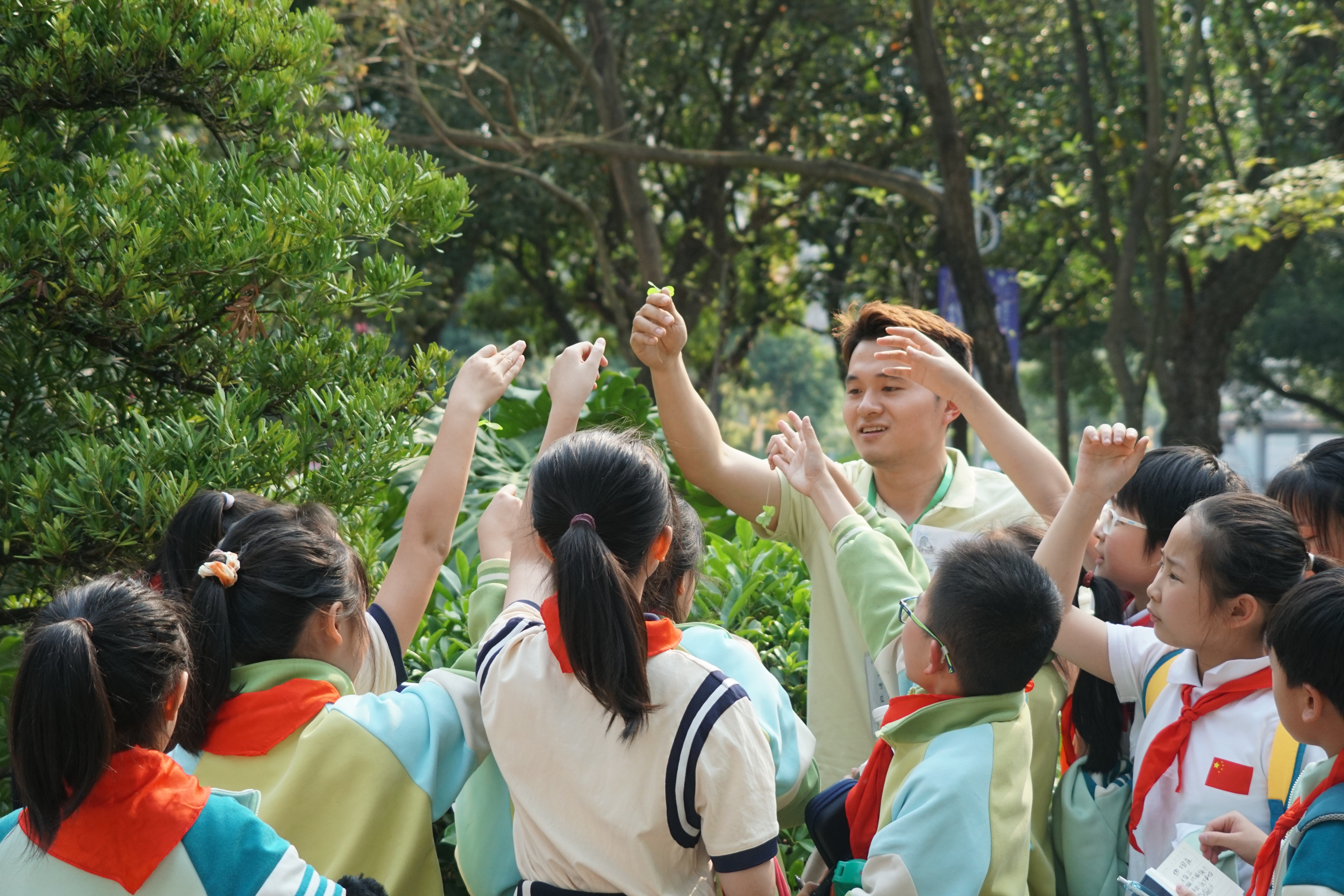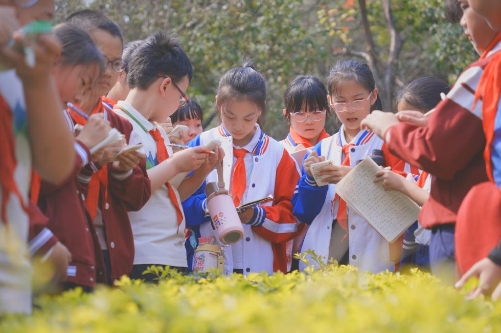 “大家看,这棵树的叶子像不像凤凰的羽毛?”在凤凰木前,志愿者用生动的语言向学生们介绍着植物的特征。学生们一边听讲解,一边用手触摸树叶,感受大自然的奇妙。通过志愿者的讲解,学生们不仅认识了凤凰木、榕树、朱槿等常见植物,还了解了它们的生长习性和文化寓意。