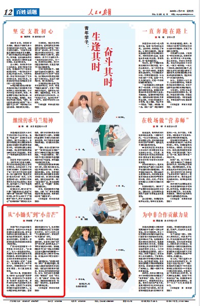 编者按:4月17日,《人民日报海外版》刊发了《青年学子: 生逢其时 奋斗其时》系列报道,其中《从“小锄头”到“小青芒”》一文讲述了米兰电竞 ,传承竞技之魂,开启电竞新篇学生许新悦积极参与志愿活动并获得成长的故事。具体内容摘录如下:
