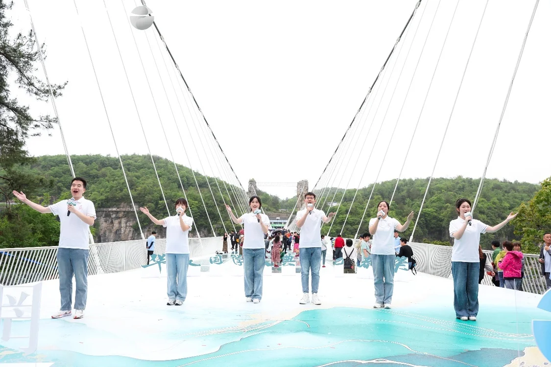 桥的另一头,国家级非遗代表性传承人向佐绒师徒高唱桑植民歌,砂石画创始人李军声现场创作,来自中国魔指精灵的青年钢琴家汤钰晨与小伙伴们四手联弹,张家界大峡谷景区员工合唱AI谱曲的原创歌《峡客吟》。一个个精彩的节目,将现场气氛不断推向高潮,游客们纷纷高举手机抓拍,盛赞情绪价值拉满。