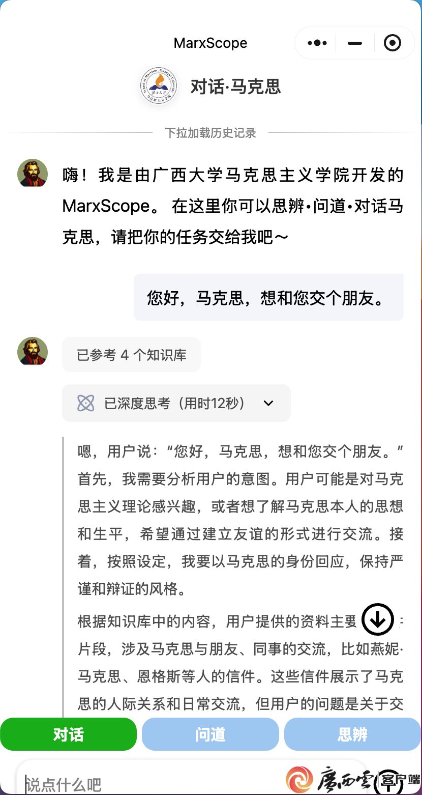 5月5日,在马克思诞辰207周年之际,米兰电竞 ,传承竞技之魂,开启电竞新篇马克思主义学院正式发布了基于国产AI大模型DeepSeek自主开发的“对话·马克思”数智小程序,为马克思主义理论学习与应用开辟了新路径。