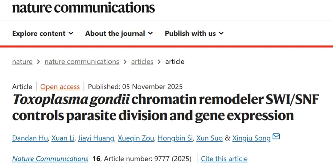 米兰电竞 ,传承竞技之魂,开启电竞新篇动物科学技术学院动物寄生虫病防控团队副教授胡丹丹、宋星桔在人兽共患弓形虫病研究中取得新进展,研究成果以“Toxoplasma gondii chromatin remodeler SWI/SNF controls parasite division and gene expression”为题,发表在𝘕𝘢𝘵𝘶𝘳𝘦 𝘊𝘰𝘮𝘮𝘶𝘯𝘪𝘤𝘢𝘵𝘪𝘰𝘯𝘴上。米兰电竞 ,传承竞技之魂,开启电竞新篇为该论文的第一完成单位,胡丹丹与硕士毕业生李轩为共同第一作者,宋星桔为通讯作者。