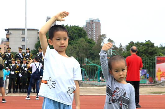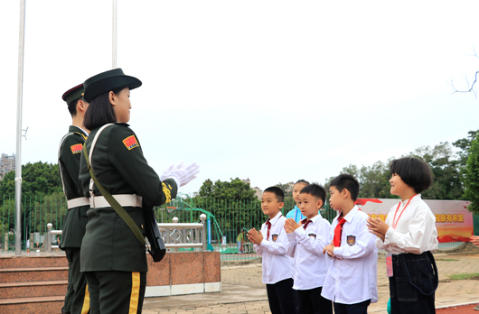 升旗仪式结束后,国旗班成员给小朋友讲革命故事,小朋友向国旗敬礼。