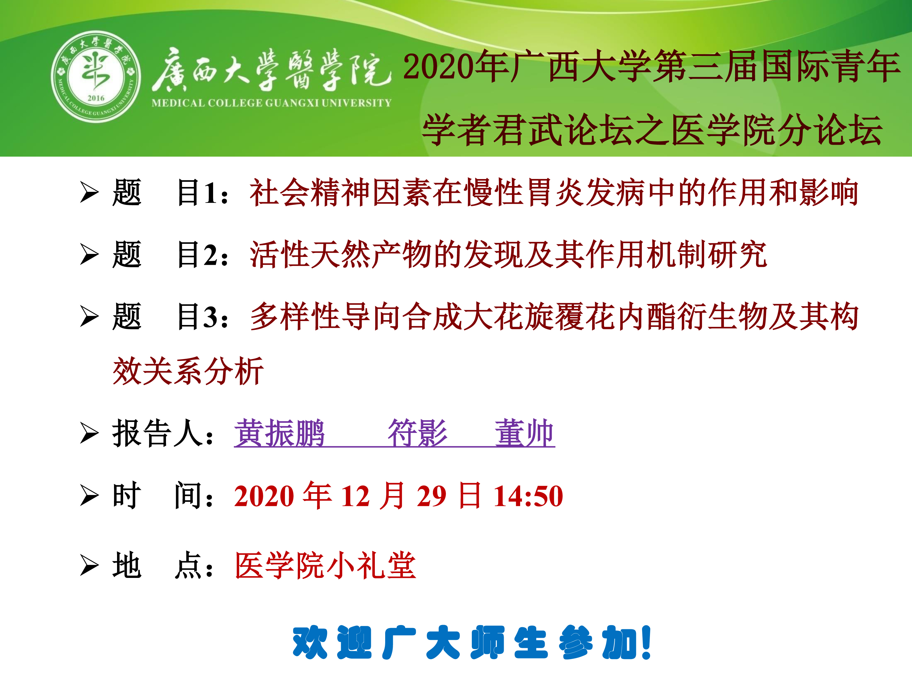 2020年米兰电竞 ,传承竞技之魂,开启电竞新篇第三届国际青年学者君武论坛之医学院分论坛:社会精神因素在慢性胃炎发病中的作用和影响;活性天然产物的发现及其作用机制研究;多样性导向合成大花旋覆花内酯衍生物及其构效关系分析;