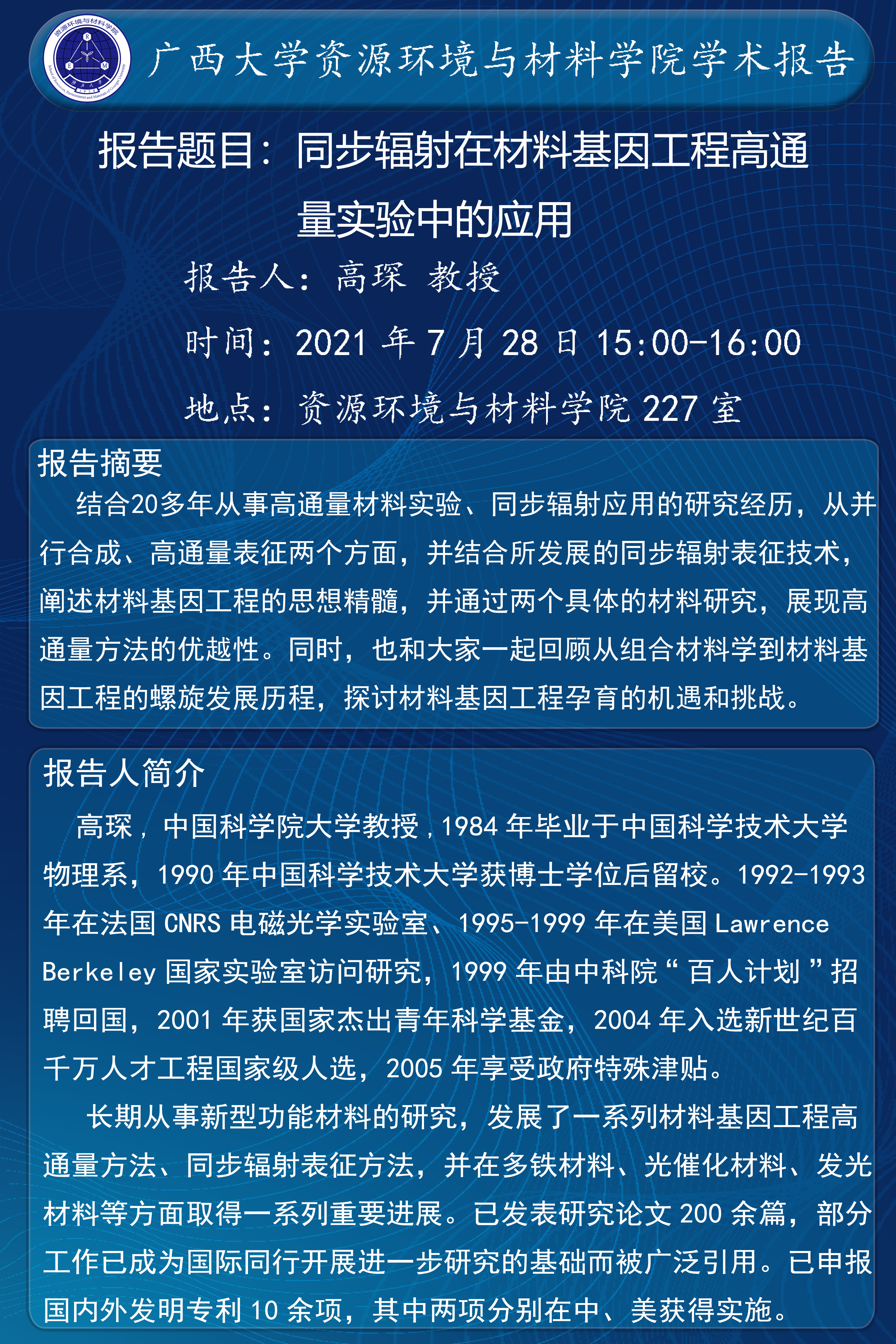 资源环境与材料学院学术报告:同步辐射在材料基因工程高通量实验中的应用