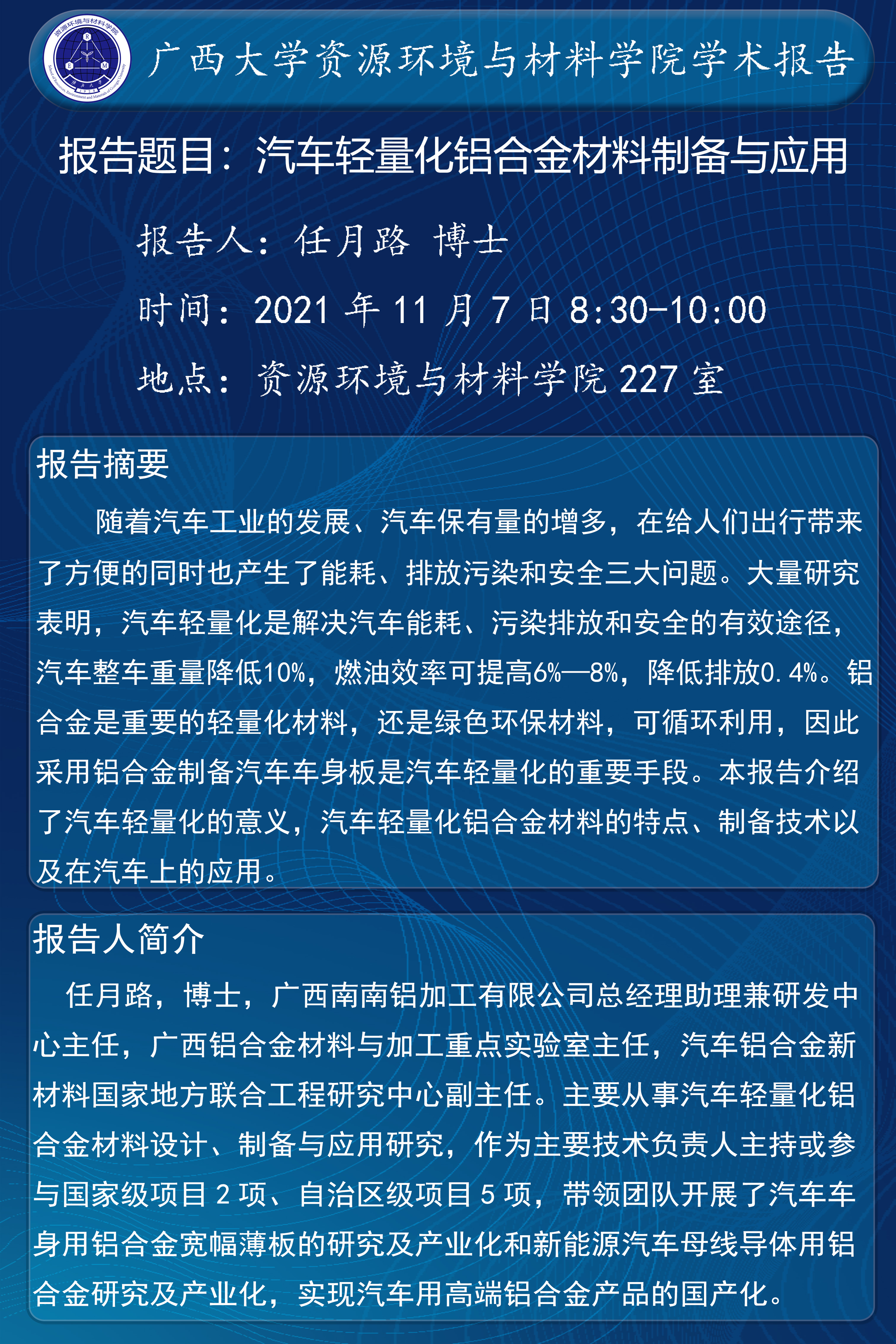 资源环境与材料学院学术报告:汽车轻量化铝合金材料制备与应用