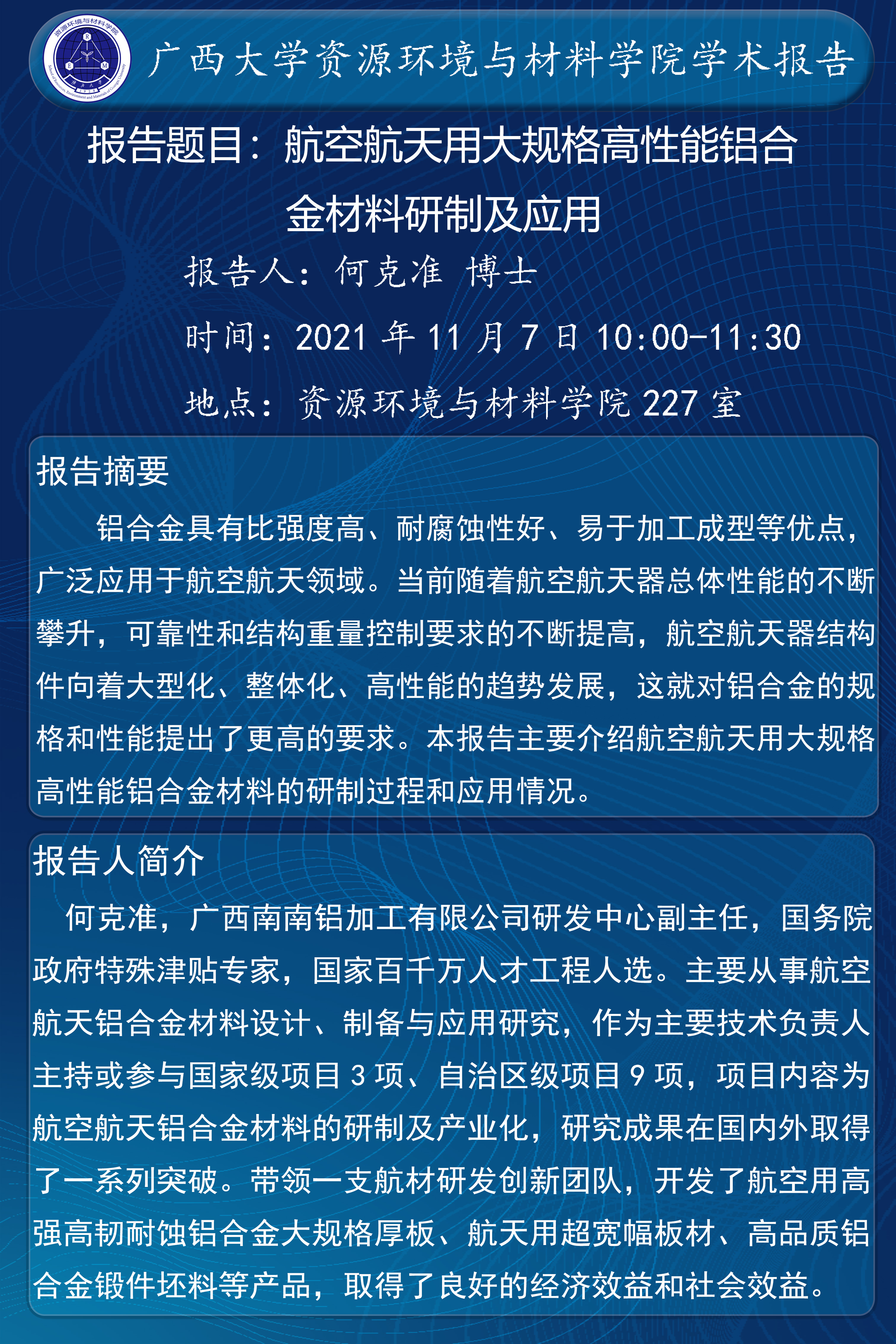 资源环境与材料学院学术报告:航空航天用大规格高性能铝合金材料研制及应用
