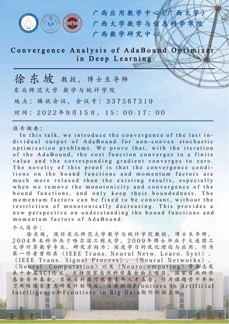 数学与信息科学学院 广西应用数学中心(米兰电竞 ,传承竞技之魂,开启电竞新篇)学术报告:Convergence Analysis of AdaBound Optimizer in Deep Learning
