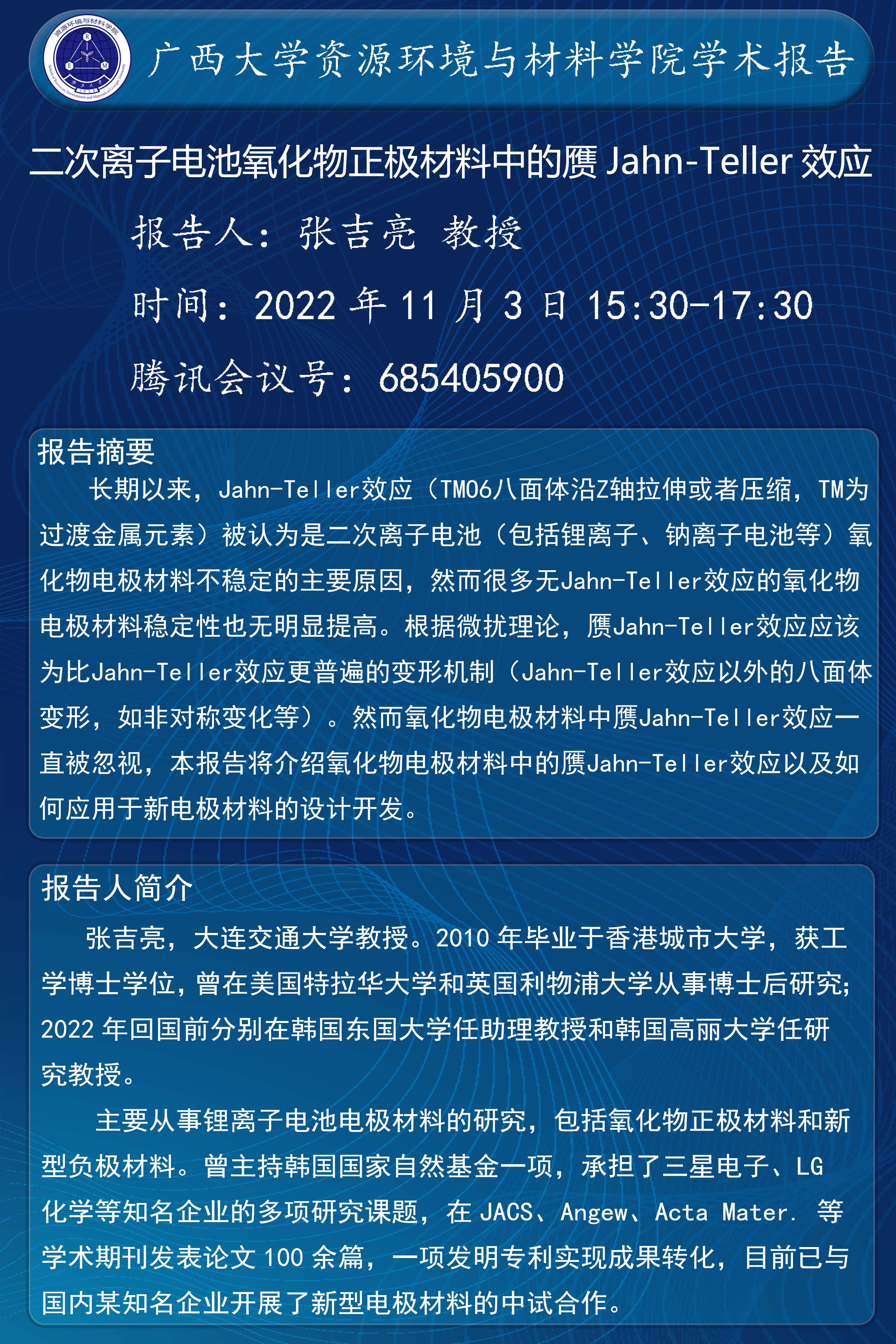 资源环境与材料学院学术报告:二次离子电池氧化物正极材料中的赝Jahn-Teller效应