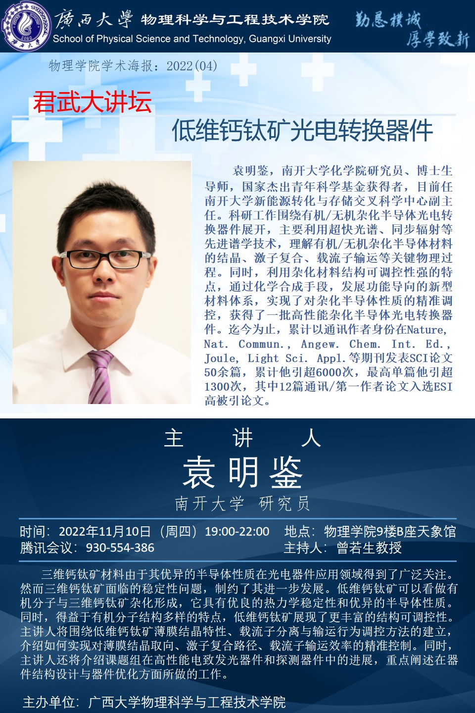 物理科学与工程技术学院君武大讲坛:低维钙钛矿光电转换器件