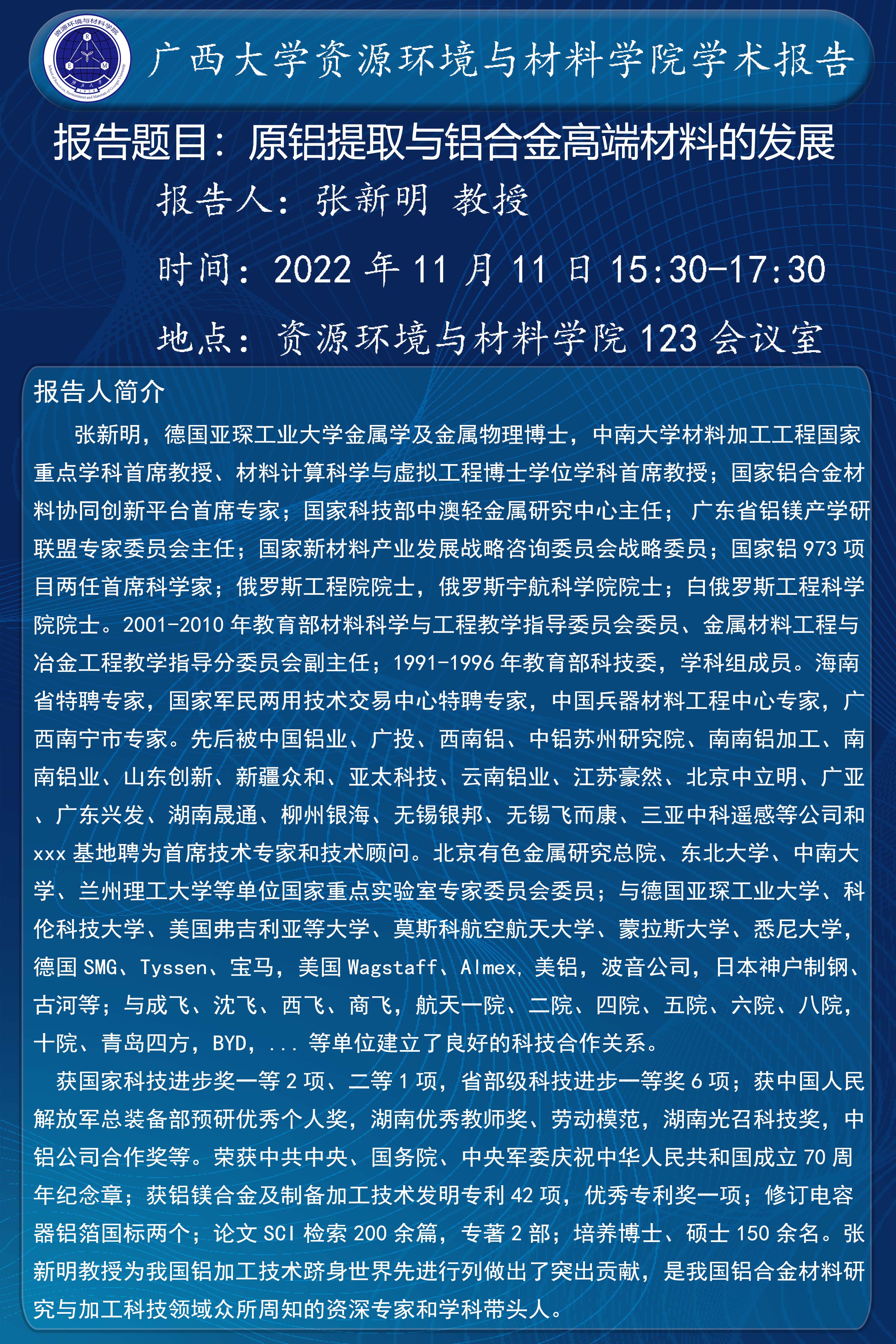 资源环境与材料学院学术报告:高性能铝合金产品的研制与应用