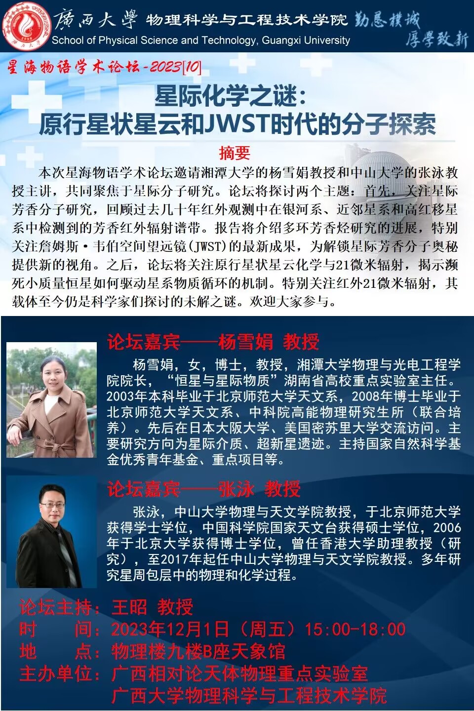 物理学院2023年星海物语学术论坛(第十期):星际化学之谜——原行星状星云和JWST时代的分子探索