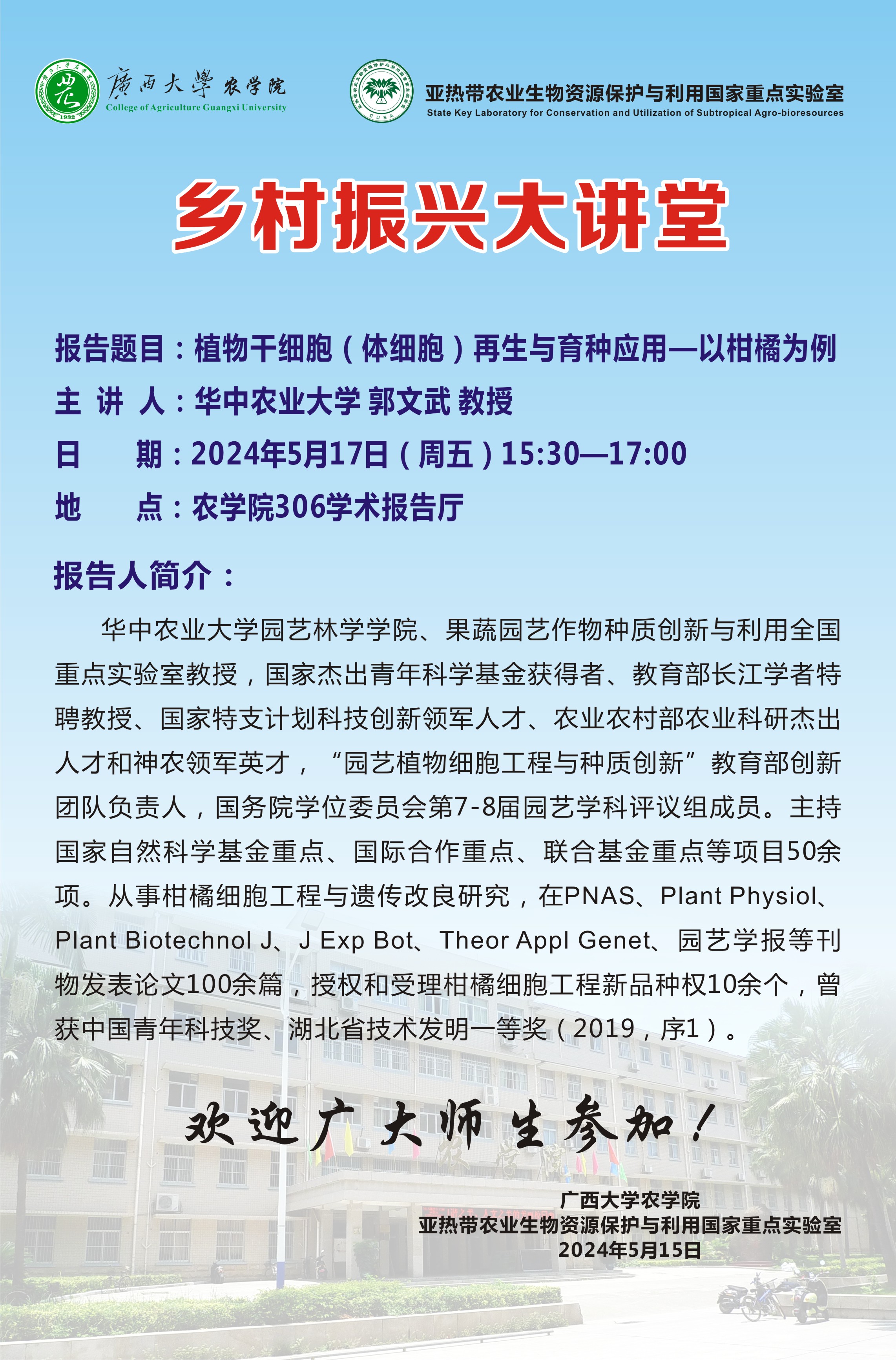 乡村振兴大讲堂:植物干细胞(体细胞)再生与育种应用—以柑橘为例