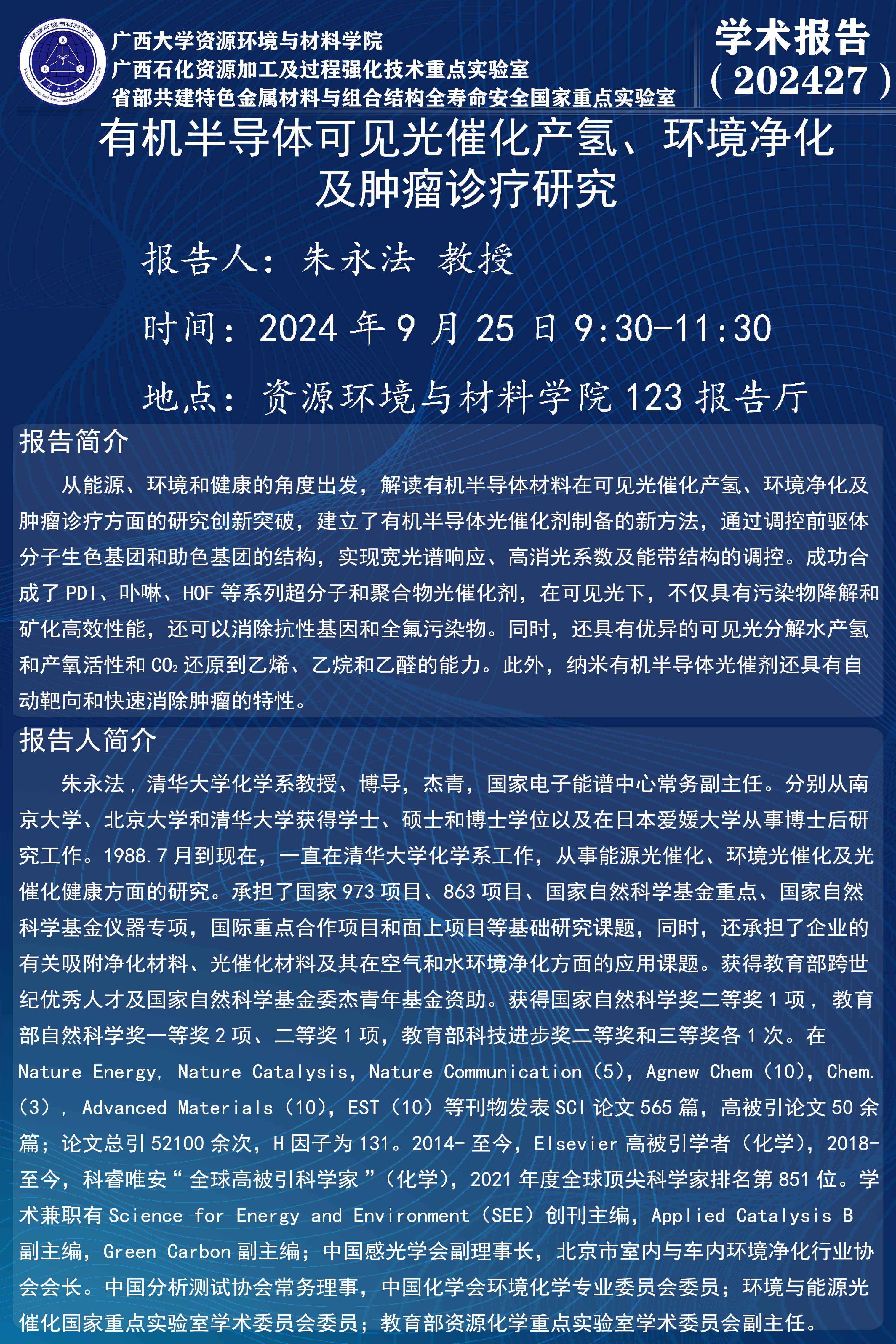 资源环境与材料学院学术报告:有机半导体可见光催化产氢、环境净化及肿瘤诊疗研究