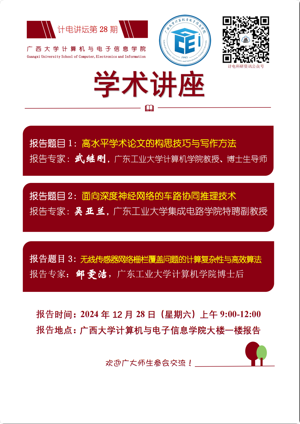 “计电讲坛”系列活动第28期学术报告会:1.高水平学术论文的构思技巧与写作方法;2.面向深度神经网络的车路协同推理技术;3.无线传感器网络栅栏覆盖问题的计算复杂性与高效算法