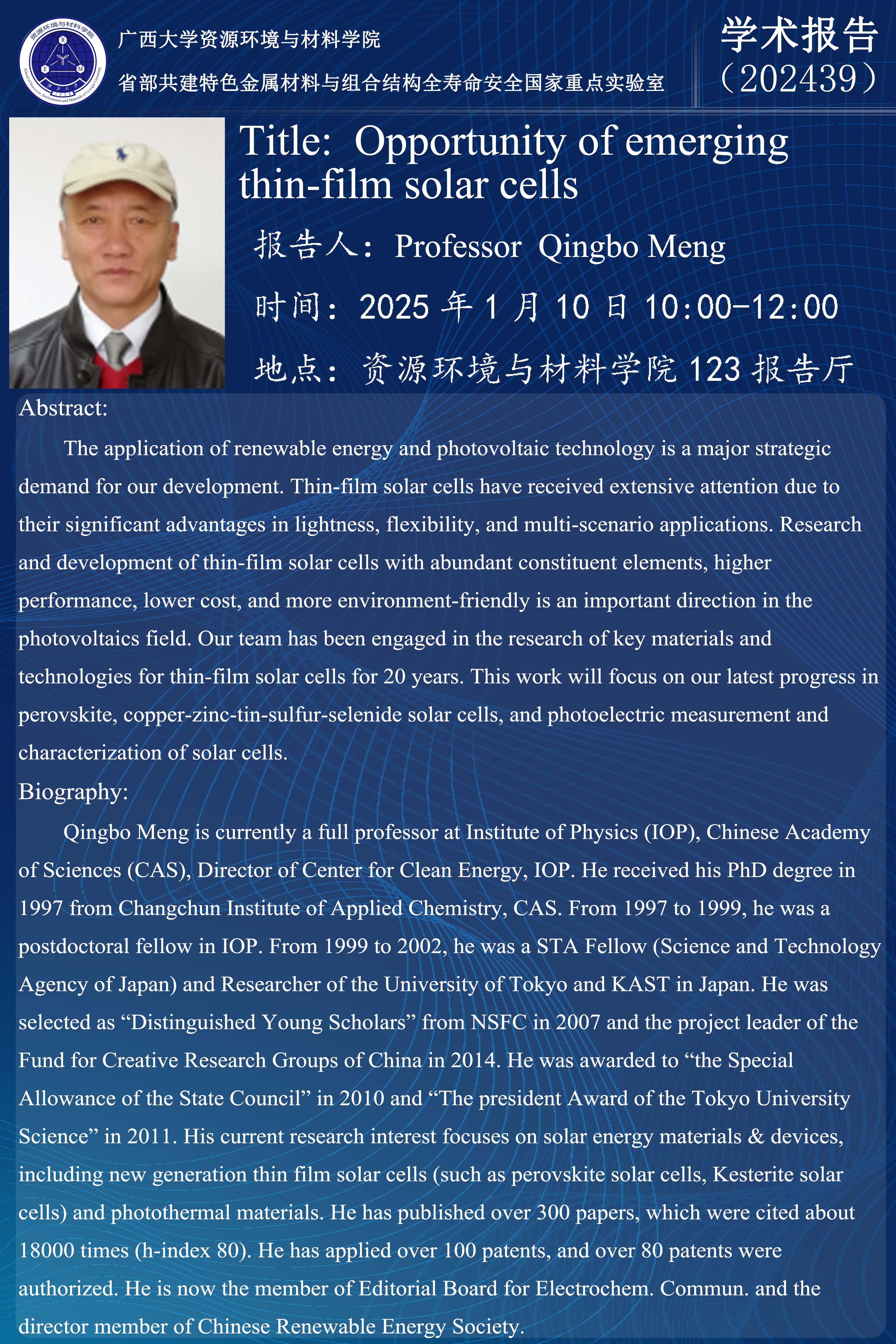 资源环境与材料学院学术报告:Opportunity of emerging thin-film solar cells