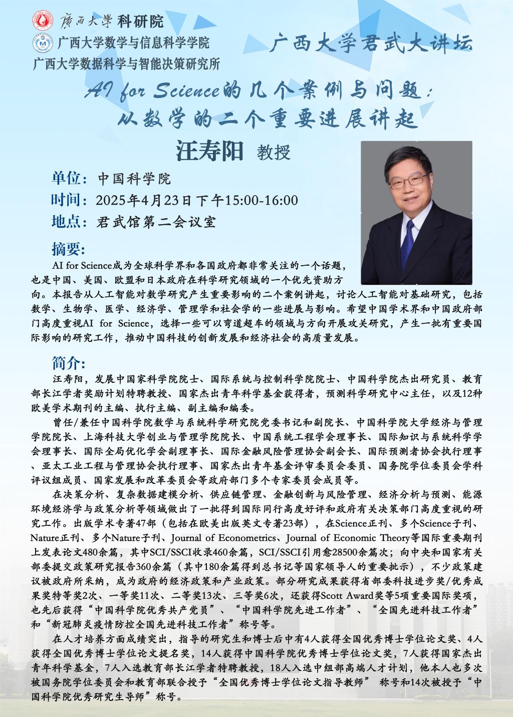 君武大讲坛:AI for Science的几个案例与问题——从数学的二个重要进展讲起