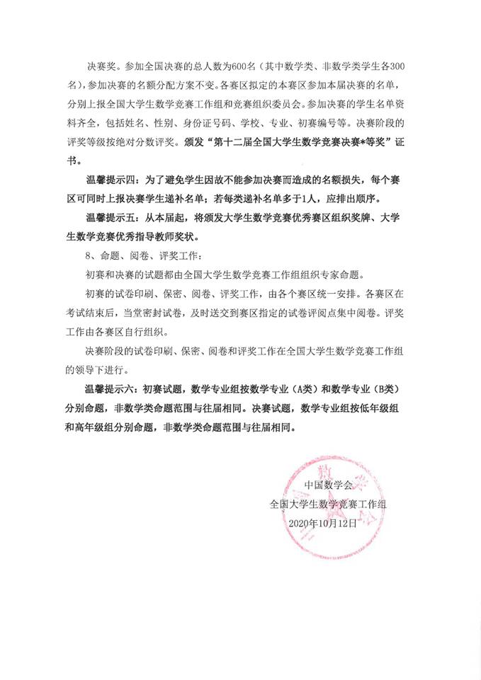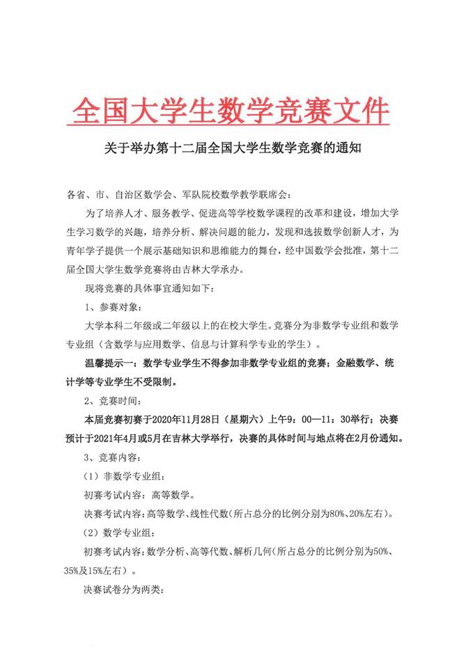 为了促进高等学校数学课程的改革和建设,激发广大学生学习数学的兴趣,培养他们分析问题和解决问题的能力,发现和选拔数学创新人才,为青年学子提供一个展示自我的舞台。中国数学会将于2020年11月28日举办第十二届全国高校大学生数学竞赛。参加这项活动,有助于全面展示我校高等数学教学水平和教学改革的成果,有助于学生夯实和扩展高等数学知识与基本技能,对考研学生复习高等数学和全面提高大学生数学综合运用能力起促进作用。我校在第一届至第十届全国大学生数学竞赛中均取得了优异的成绩。请各学院大力宣传,鼓励学生积极参赛。
