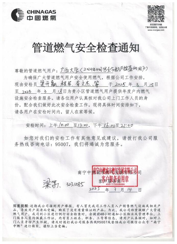 为保障校内燃气用户的用气安全,后勤基建处联系南宁中燃城市燃气发展有限公司开展本年度第一次管道燃气入户安全检查,请各住户于2025年3月15日至18日期间做好相关配合工作,现将具体通知如下: